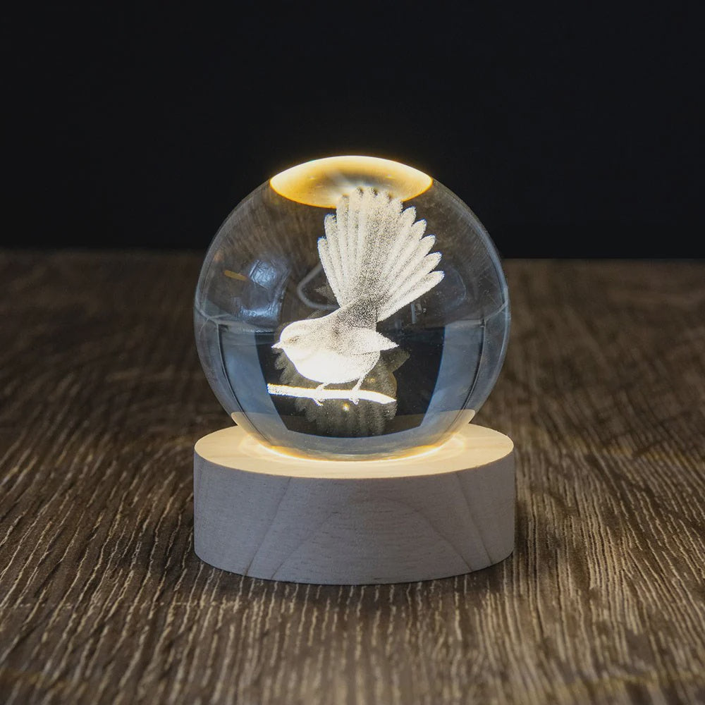 The Fantail LED Globe showcases a 3D laser-engraved design within a 60mm glass sphere, capturing the lively form of this much-loved native bird. Resting on a wooden LED base, the engraving is softly illuminated to highlight its fine details. USB powered with an in-line switch, and presented in a gift box.