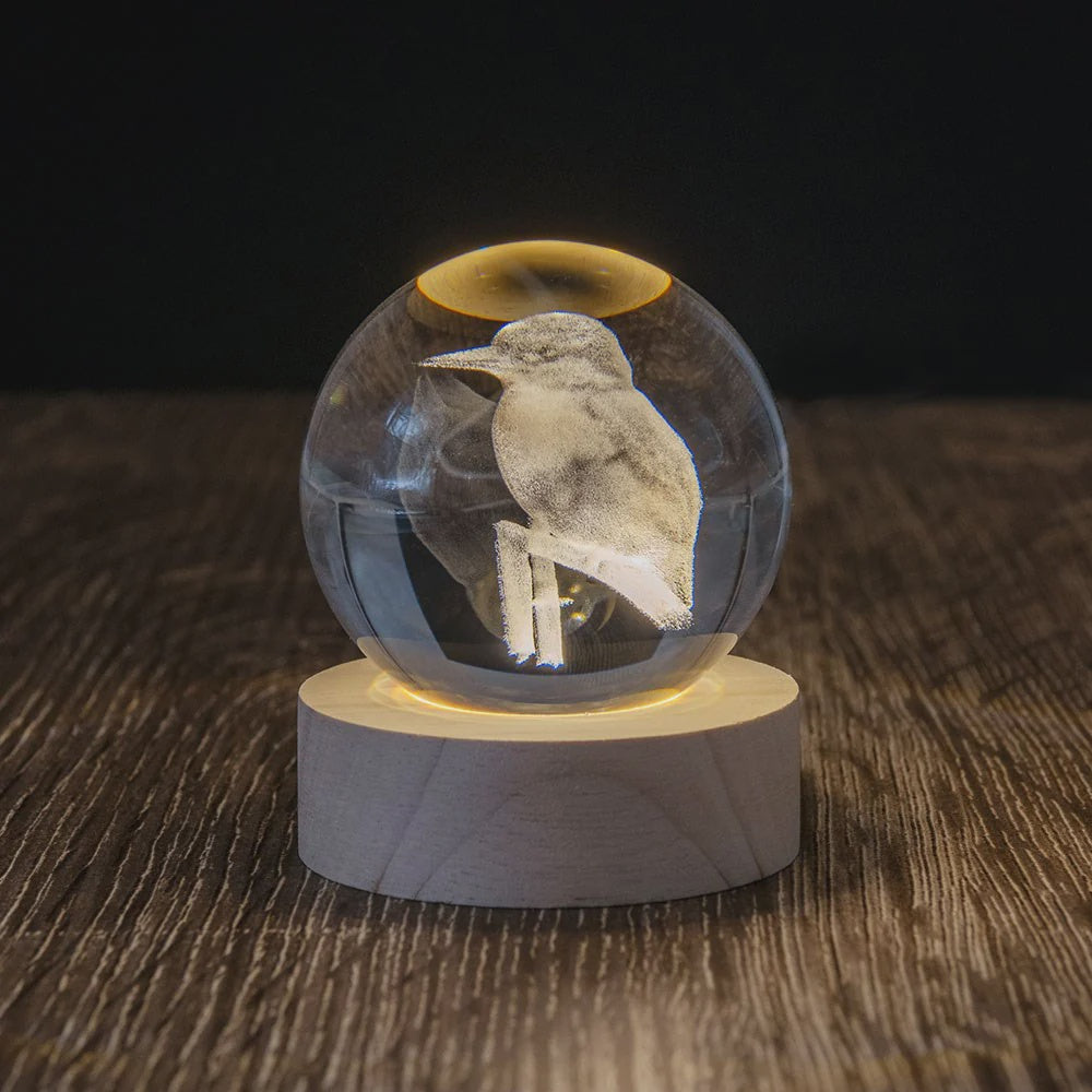 The Kingfisher LED Globe contains a 3D laser-engraved design of this striking native bird inside a 60mm glass sphere. Set on a wooden LED base, the engraving is gently illuminated to bring out its fine details. Complete with USB power, in-line switch, and gift box packaging.