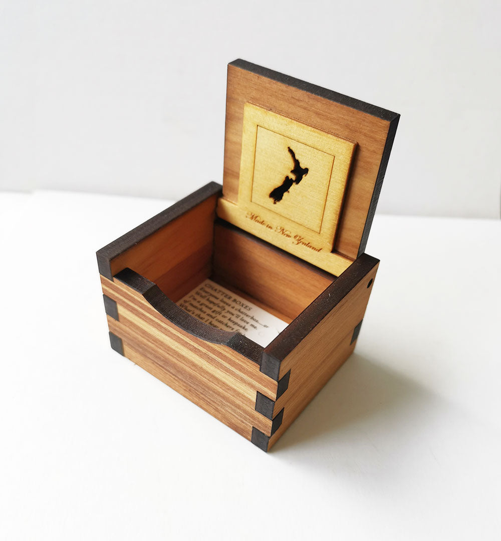 Rimu veneer boxes with lid. Inner lid has of NZ with ‘Made in New Zealand’ engraved. Inlaid with Kiwi design & Paua Shell. Perfect gift box for pendants brooches and earrings.