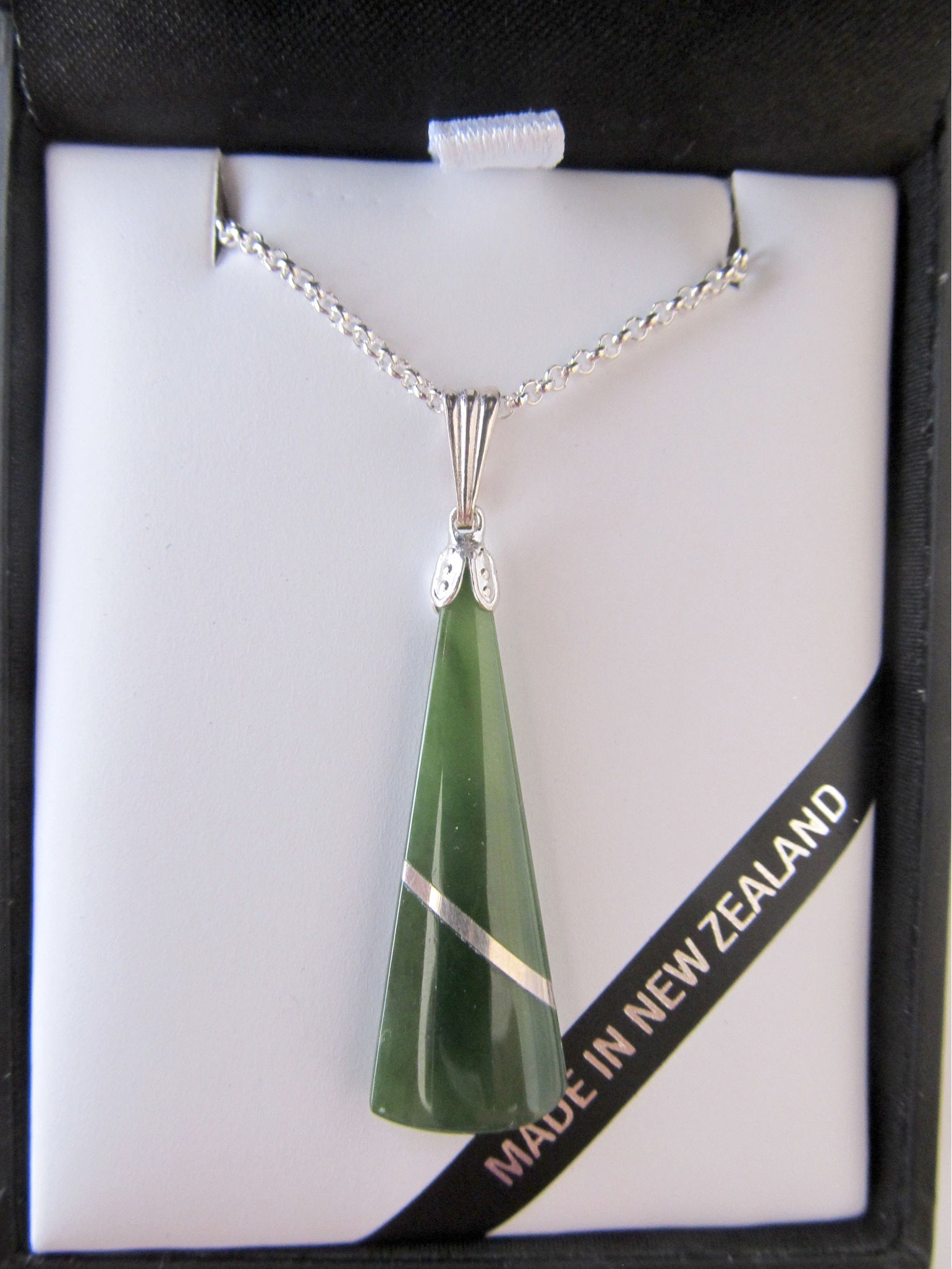 Wedge shaped greenstone pendant on sterling silver chain.  The greenstone wedge is 32 mm long and 10mm wide with a sterling silver band inlaid.