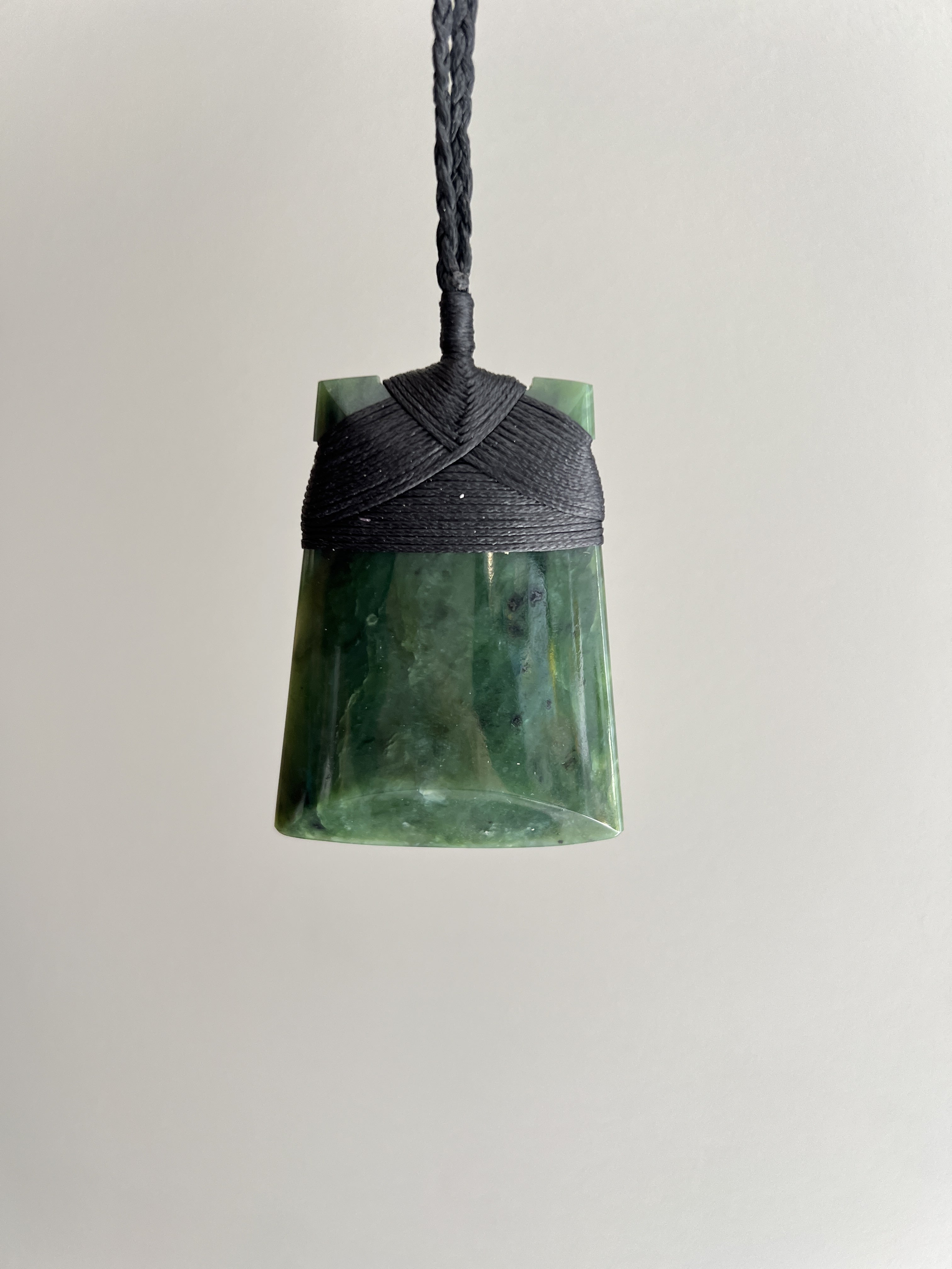 Each piece of pounamu is lashed onto an adjustable hand woven wax cord that measures 70cm at full length.