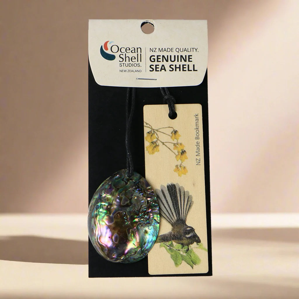 Size: The bookmark measures 78mm x 28mm and is crafted from printed pine with a soft cord that connects to the hanging pāua gem (approx. 40mm tall, size and shape will vary naturally).
