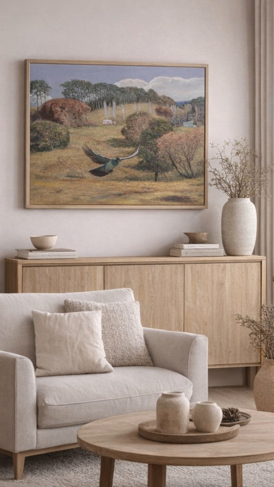 This original painting captures a tūī mid-flight, moving across rolling farmland and sheltering trees.