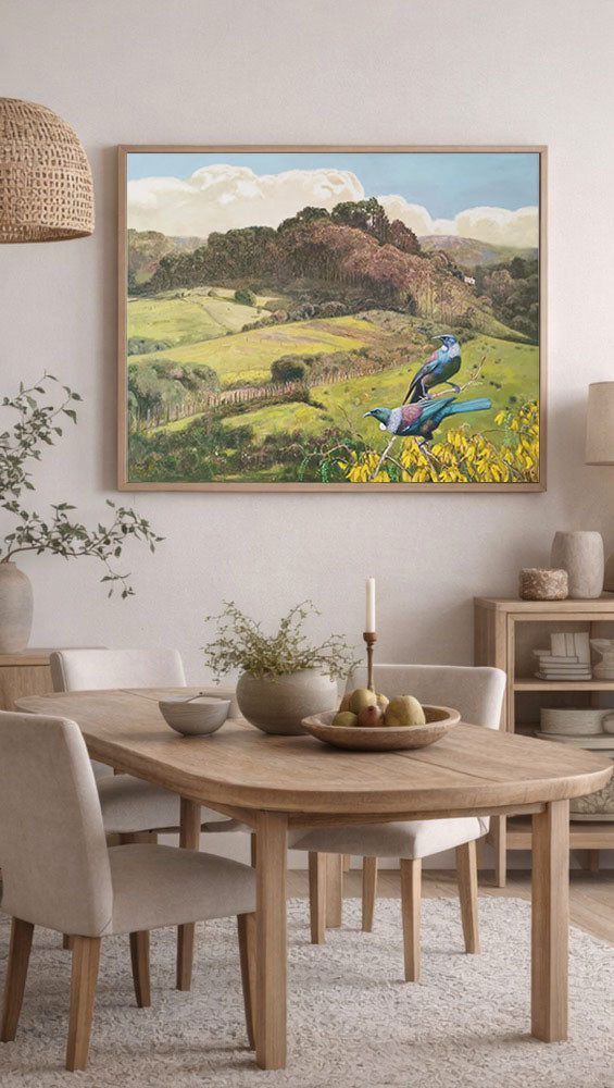 This original painting captures the gentle rhythm of the land - rolling hills, open fields, and the quiet presence of tūī watching over the valley.