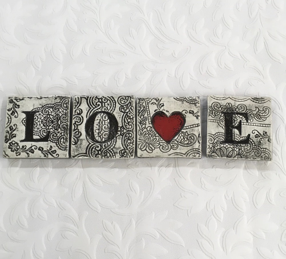 This beautiful set of ceramic tiles are a stylish statement of LOVE ! Timeless in design and in white and black these really are a cherished gift for so many occasions. Glazed in a soft white with a black lace imprint , each tile is handmade so is totally unique to the set ,Enhanced by a rich red heart , they are a piece that will be loved for years to come . The perfect present for weddings, anniversaries , birthdays or to say i love you